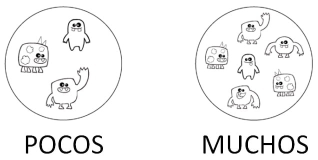 Estimar 3 | Realizar estimaciones de cantidad con números naturales: Muchos – Pocos. Te facilitamos unos ejercicios imprimibles donde aprenderás a comparar dos conjuntos de elementos y a distinguir cuál simboliza el concepto “muchos” y cuál “pocos“ | |||||||