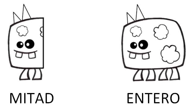 Estimar 5 | Reconocer por representación gráfica: Entero – Mitad. Te mostramos unas actividades en formato PDF donde comparar dos elementos indicando cuál manifiesta la cualidad “entero” (como unidad completa) y cuál la cualidad “mitad” (partir en dos partes iguales una cantidad inicial) | |||||||