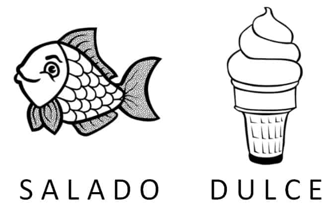 Discriminar las cualidades: Dulce – Salado. Te mostramos unas actividades en formato PDF donde comparar dos alimentos indicando cuál manifiesta la cualidad “dulce” y cuál la cualidad “salado” | ||||||||