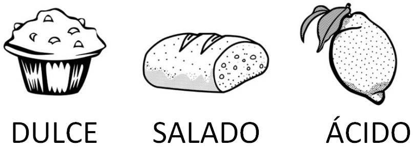 Discriminar las cualidades: Dulce – Salado – Ácido. Te facilitamos unos ejercicios descargables donde debes comparar tres alimentos cotidianos y pintarlos a partir de sus tres cualidades distintivas: “dulce”, “salado” y “ácido” | ||||||||
